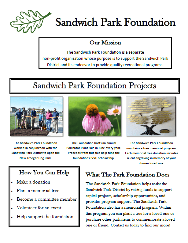 The Sandwich Park Foundation is a 501c3 non-profit organization that helps support the endeavors of the Sandwich Park District. The Sandwich Park Foundation was formed to assist the Sandwich Park District in funding projects and programs that the Sandwich Park District cannot financially accomplish through its taxing dollars. Together, the Sandwich Park Foundation and the Sandwich Park District give the Sandwich community more opportunities to enjoy Parks and Recreation, which in turn helps promote new skills, wellness, social interaction and conservation.