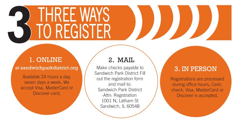 Registrations received by mail will be processed as soon as they are received. If a program is already full, you will be notified as soon as possible. Payment must be included with your registration. Please make checks payable to the Sandwich Park District. If you are paying with a credit card, please include your credit card information on the registration form. A fee of $25.00 will be assessed on all checks that are returned from the bank due to insufficient funds.