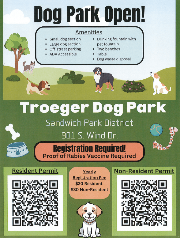 Welcome to the NEW Sandwich Park District Troeger Dog Park located in Milestone Park, 1375 N. Castle St. On Thursday, October 5, 2023, the Dog Park officially opened to the public. All patrons, resident or nonresident, as well as their furry friends are welcome at the new dog park.